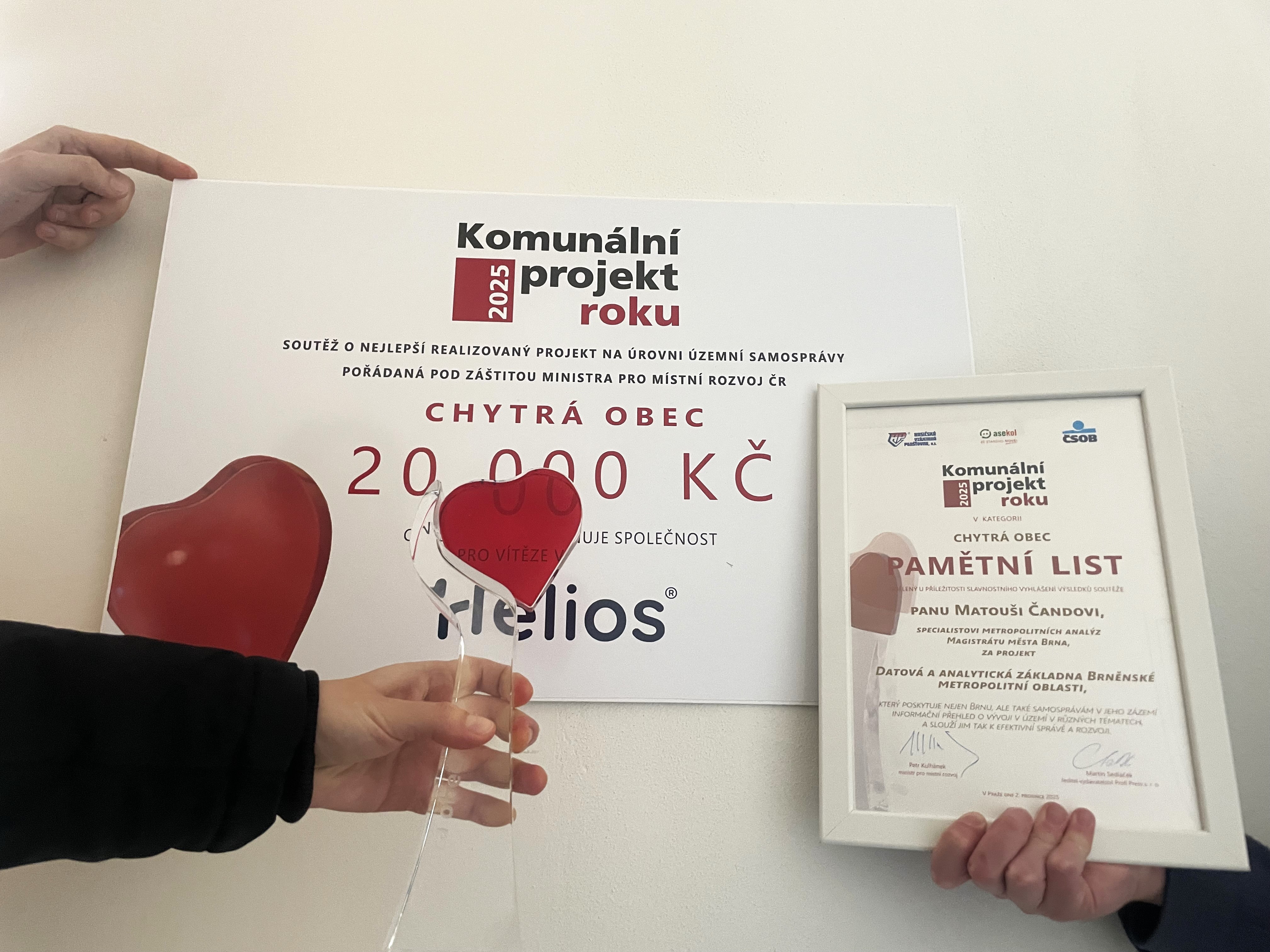 Po Ceně ministerstva vnitra za inovace bodoval sběr, analýza a zpřístupnění dat o Brněnské metropolitní oblasti také v soutěži Komunální projekt roku. Porota ho ocenila v kategorii Chytrá obec.
