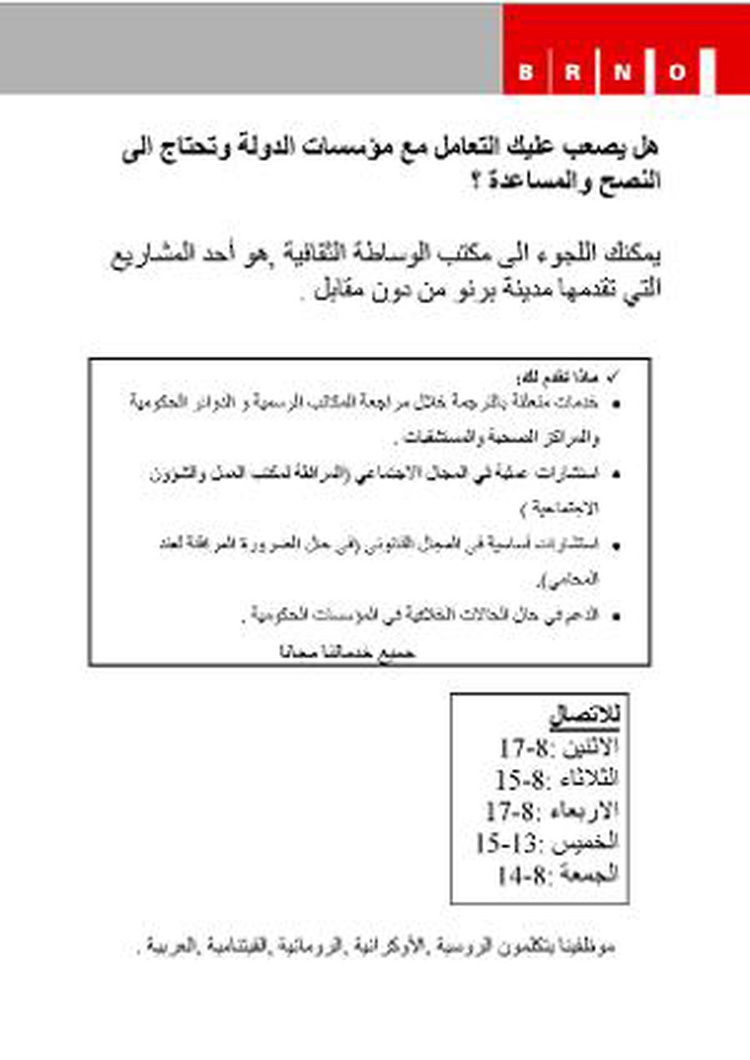 Brno proto testuje projekt zvyšující srozumitelnost úřadů vůči cizincům s cílem rychle a úspěšně cizince do společnosti zapojit. Tito lidé se o projektu dozvědí pomocí letáků, které lze najít nejen v místech, kde se zdržuje daná komunita, ale i ve veřejných institucích, jako jsou školy, školky, úřady apod.