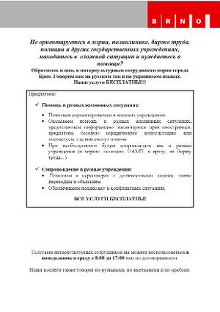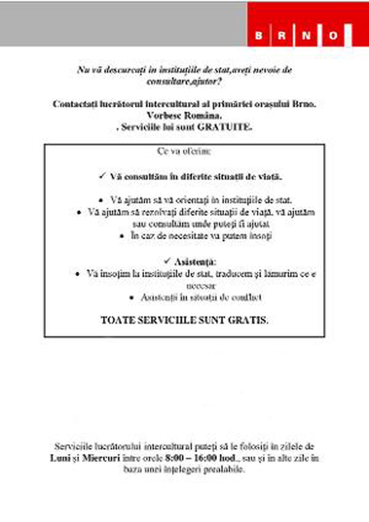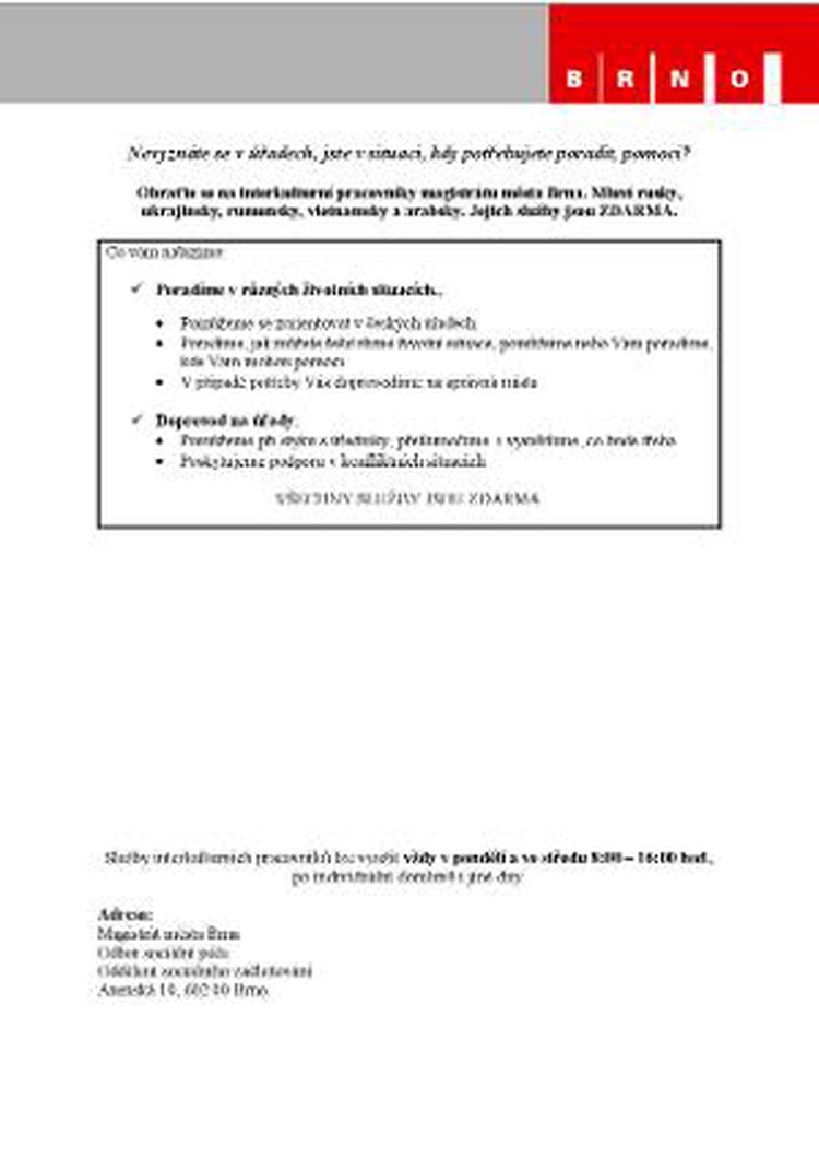 (red) - V Brně žije zhruba 30 tisíc cizinců ze 148 zemí světa a jejich počet každým rokem narůstá. Vedení města se rozhodlo zavést aktivní, včasný a preventivní přístup v oblasti integrace cizinců. O tomto projektu informuje i pomocí letáků v několika jazycích.