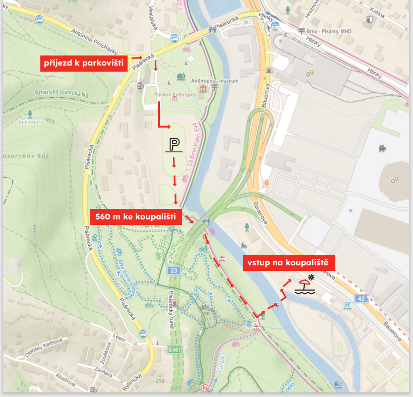 Již příští sezónu budou v areálu brněnského výstaviště vybudovány parkovací plochy, od nichž povede pochozí lávka přes ulici Bauerovu přímo před vstup na koupaliště, což výrazně zvýší komfort návštěvníků největšího brněnského koupaliště.