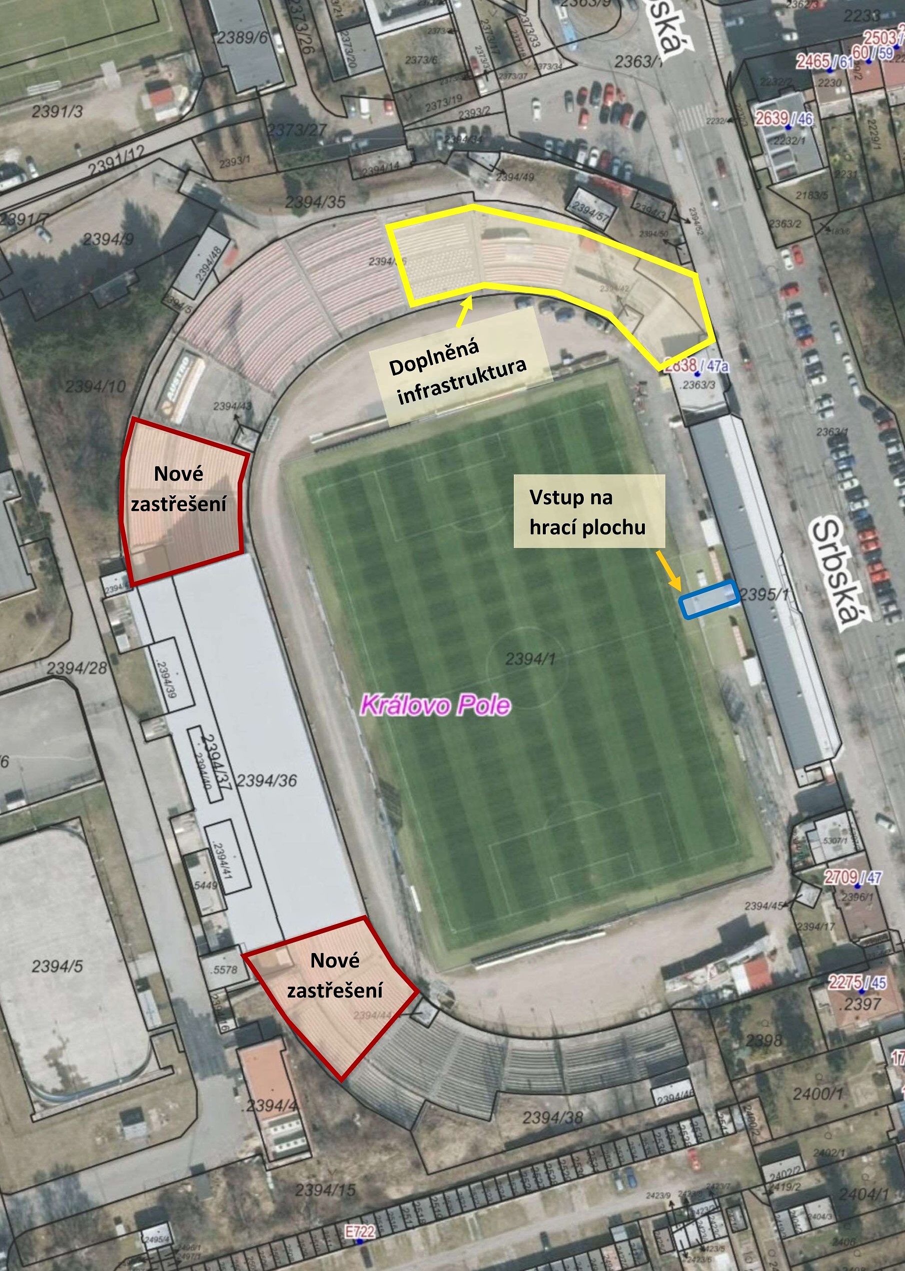 Plánovaný rozsah úprav infrastruktury stadionu je poměrně široký. „Několik požadavků vyřeší soustava mobilních kontejnerů v místech vstupu z ulice Srbská, kde bude umístěna ošetřovna diváků, pracovní místnosti pro média, fotografy, komentátory a další dvě jako televizní studia. Dále se bude muset vybudovat krytý vstup na hřiště, rozšířit zastřešení tribun i kapacita vstupů na stadion, vyměnit sedačky pro diváky, instalovat nové ozvučení a zajistit záložní zdroj energie,“ řekl radní pro oblast sportu Tomáš Aberl.