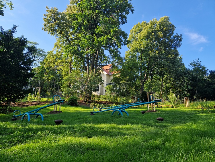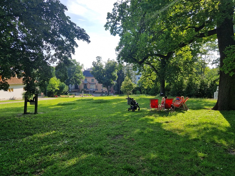 Chtělo by se říci, že od klenotu UNESCO tajnými vrátky projdete k sousední vile Löw-Beer. Avšak nejedná se o romantickou branku, ale v kontrapunktu umístěný moderní otočný turniket. Zatímco předchozí zahrada působí jako introvert, park obklopující starší vilu Löw-Beer je pravý extrovert. Na trávě jsou příhodně rozeseta lehátka, pro děti jsou nachystána vzdělávací stanoviště. To vše za doprovodu zurčící kašny u paty schodiště z domu.