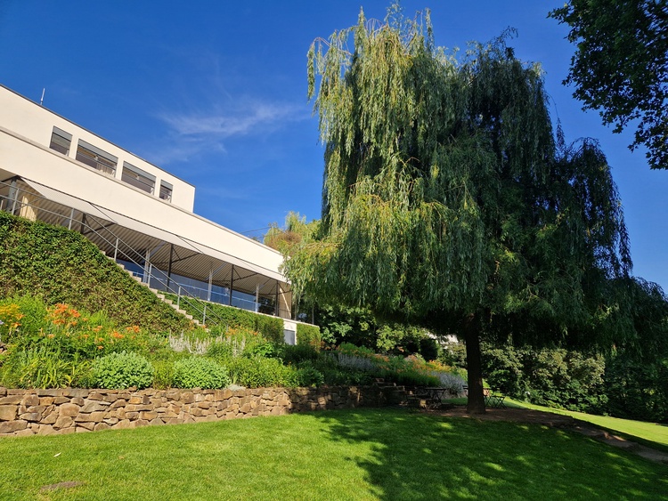 Význam vily Tugendhat vzbuzuje téměř bázeň sem jednoduše vstoupit z ulice. Sestoupit do zahrady se však vyplatí. Na podestě pod slavnou terasou na návštěvníky čekají stolky s židlemi vyzývající k posezení v kulisách přímo hmatatelné historie. Zahrada vily byla koncipována v intimním duchu, hlavní roli hraje zeleň. Nenajdete zde příliš vnějších prvků, což dává vyniknout stromům a květinám.