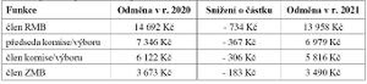 Pro členy výborů ZMB a členy komisí RMB, kteří nejsou členy ZMB, je nově schválena odměna ve výši 4 180 Kč, což odpovídá snížení o 5 % (- 220 Kč). Díky výše zmíněným opatřením dojde k úspoře 1,139 milionu korun.