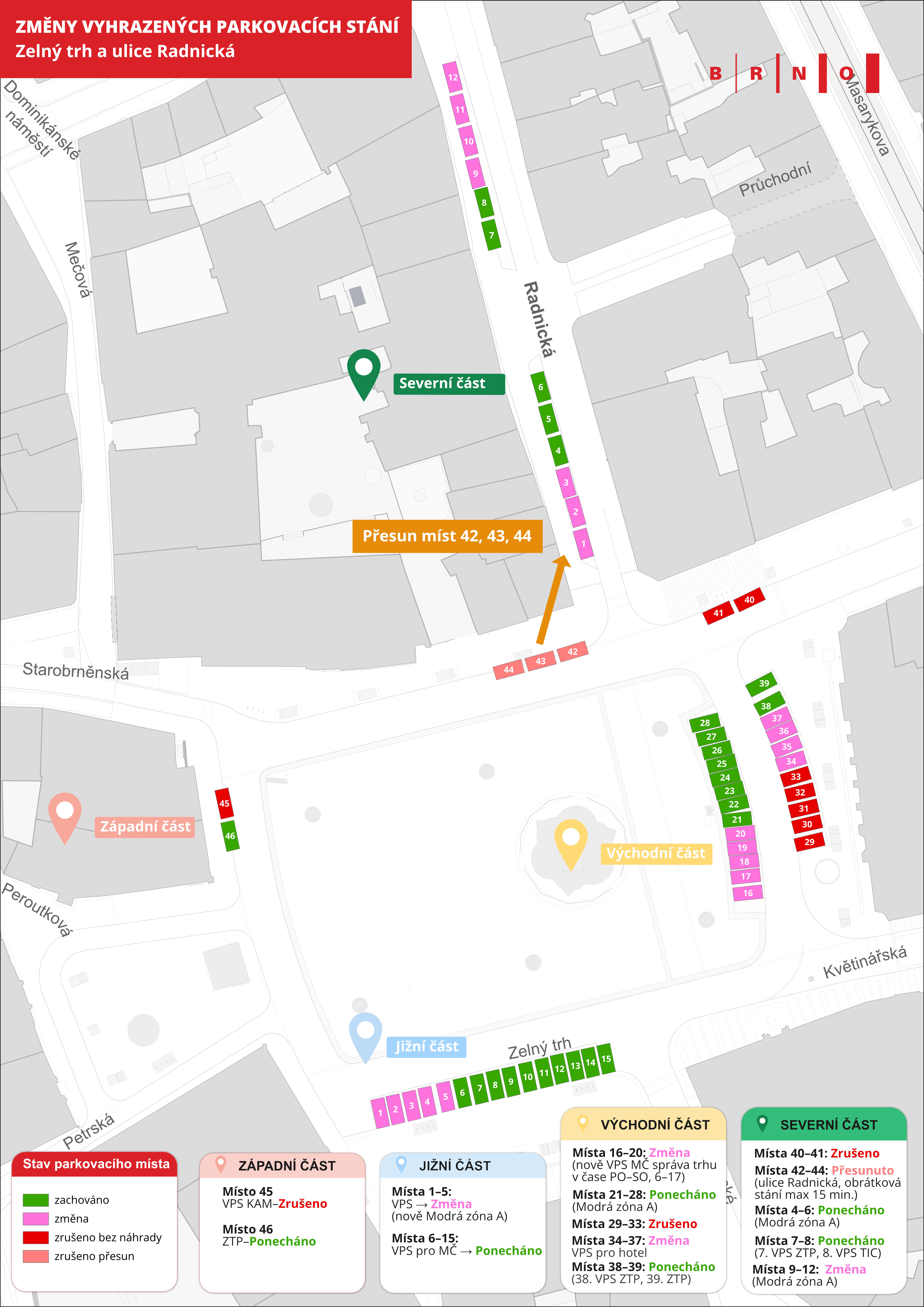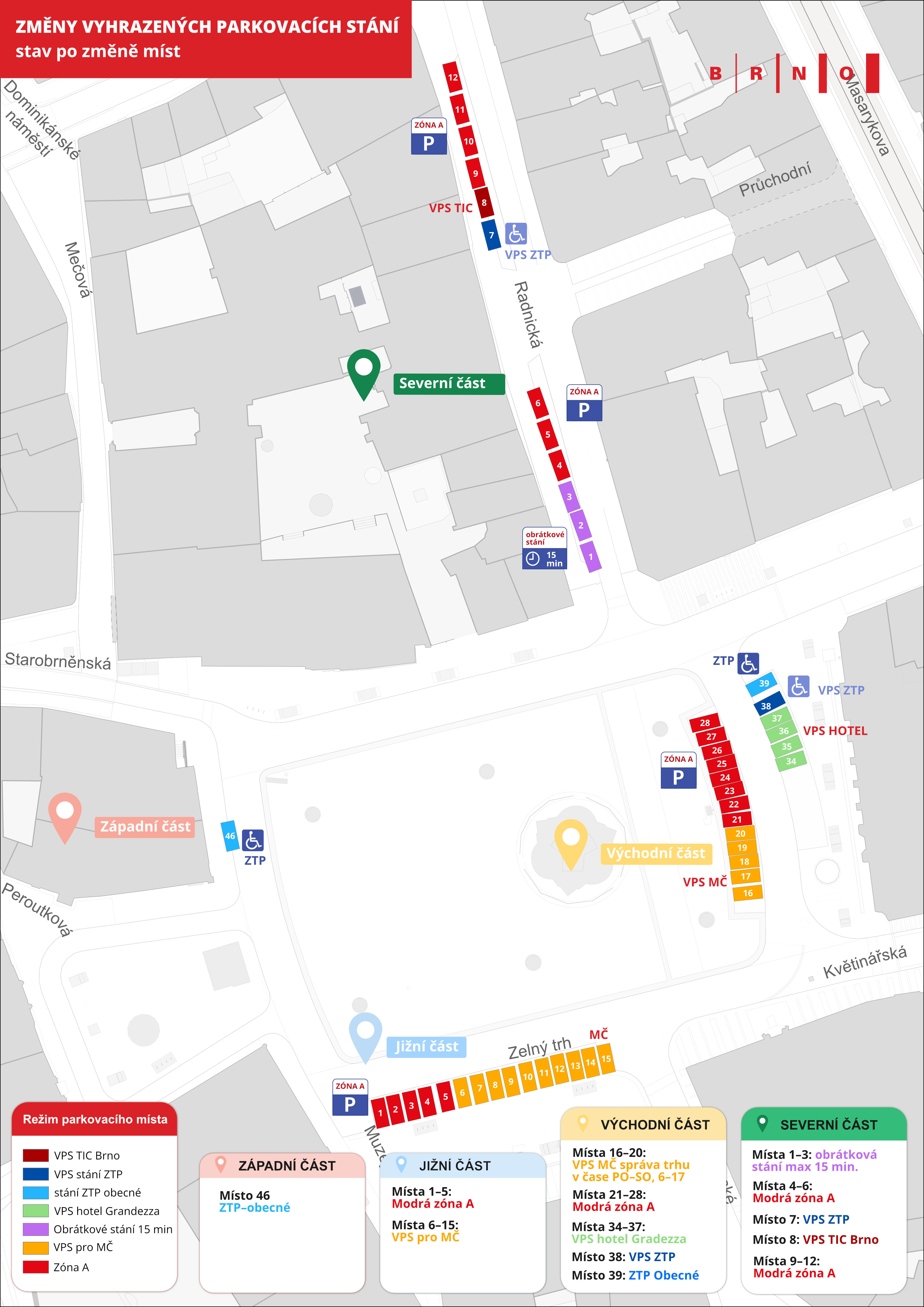 „Se zástupci městské části Brno-střed jsme projednali novou koncepci parkování na Zelném trhu a v blízké ulici Radnická. Významnou změnou je, že se zde zruší vybraná vyhrazená parkovací stání a sjednotíme režim pro správu trhu. Nově zde přibydou místa pro krátkodobé zastavení, tedy obrátková stání. Opatření budou platit postupně, a to v návaznosti na uplynutí doby platnosti smluv vyhrazených parkovacích stání. Předpokládáme, že by to mohlo být po skončení letních prázdnin,“ uvedl radní pro dopravu Petr Kratochvíl.