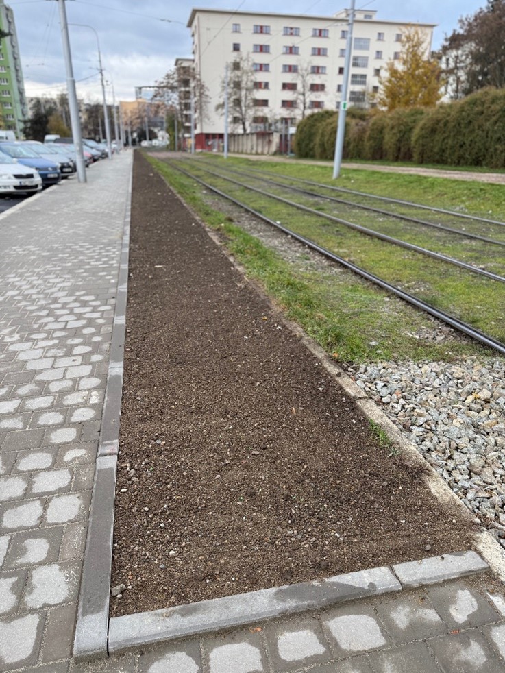 TT Veletržní – zelený pás oddělující chodník pro pěší od tramvajové tratě byl zrekultivován v podobném provedení jako jsou vyvýšené pásy na Nových sadech.