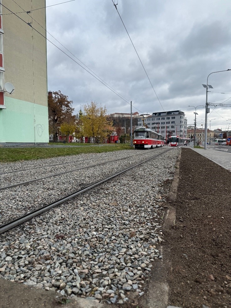 TT Veletržní – v místě tramvajové zastávky linky č. 1 a přechodu pro chodce k obytné zástavbě DPMB provedl úpravu zákrytu v podobě speciální směsi zeminy a štěrku. Následně byl tento kryt osázen suchomilnými rostlinami.