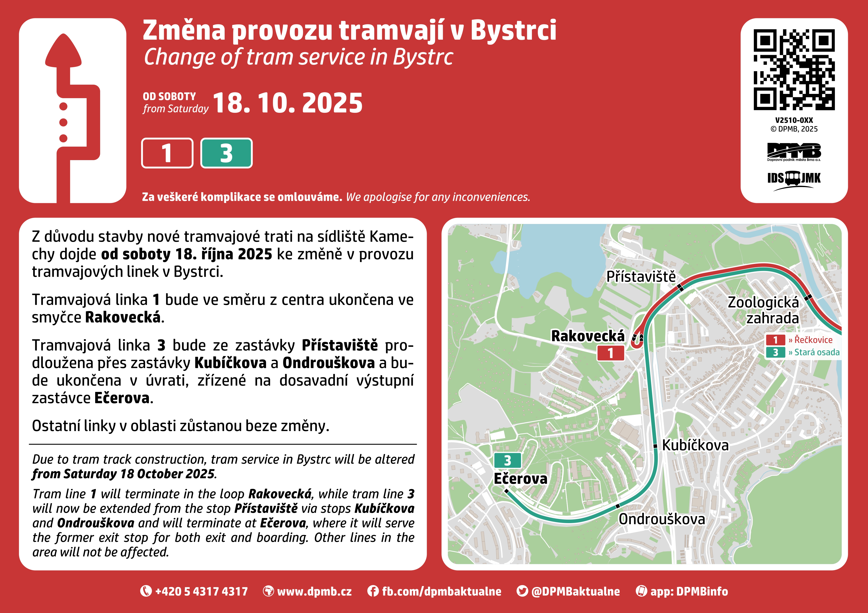 V prostoru smyčky Ečerova budou do léta 2026 probíhat stavební práce. Z tohoto důvodu se zde vloží kolejová spojka a trať do Bystrce bude ukončena úvratí. Od 18. října proto dojde ke změně v provozu tramvajových linek. Tramvajová linka 1 bude ve směru z centra ukončena ve smyčce Rakovecká. Linka 3 bude naopak prodloužena ze zastávky Přístaviště právě do zastávky Ečerova. Obsluhována bude výhradně obousměrnými tramvajemi.