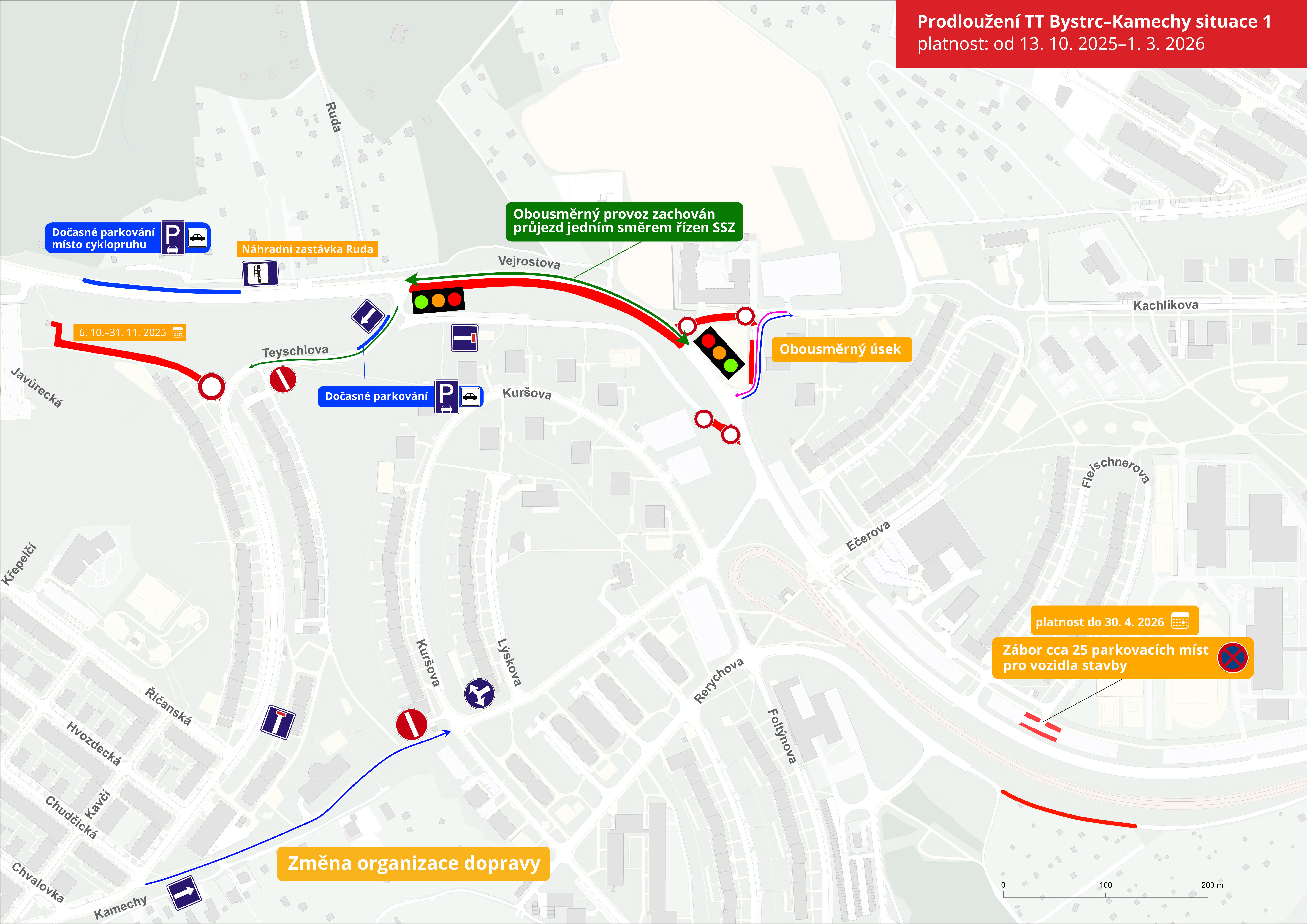 Z důvodu přeložky vodovodu bude uzavřen jeden pruh komunikace na Vejrostově v úseku od křižovatky s Teyschlovou po orientační číslo 8 (křižovatka účelová komunikace Vejrostova u centra Chovánek). Doprava zde bude řízena kyvadlově semafory v jednom pruhu. Dále se uzavře slepý úsek Teyschlovy. Průjezd touto ulicí bude možný pouze jednosměrně odbočením z Vejrostovy, které bude možné jak ve směru od Žebětína, tak z města. Ulice Kamechy bude v úseku mezi Teyschlovou a Rerychovou jednosměrná, a to ve směru na Vejrostovu.
