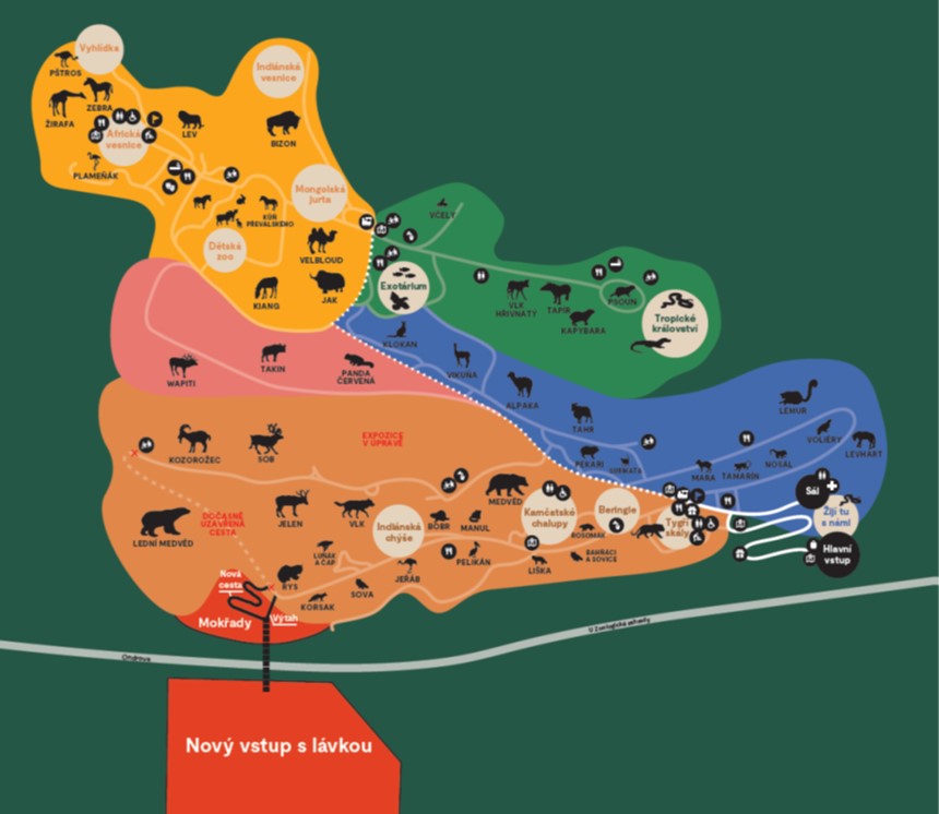 „Nový vstupní objekt se bude skládat ze dvou samostatných budov. V první budou pokladny a suvenýry, v druhé gastroprovoz. Obě nemovitosti budou mít zelenou střechu. Investiční záměr zde počítá s realizací povrchového parkoviště s kapacitou cca 290 míst. Vzniknout by mělo v jižní části pozemku, tedy nejdále od zástavby. Podmínkou je, že bude plocha maximálně osázena zelení a stromy. Součástí areálu bude lávka pro pěší přes ulici Ondrova. Ta bude končit pod cestou vedoucí k expozici ledních medvědů. K dispozici by tu měl být i výtah. Cena za lávku bude 27 milionů Kč bez DPH. Předpokládaná cena za výstavbu celého nového vstupu je cca 241 milionů Kč,“ upřesnil záměr náměstek primátorky Filip Chvátal.